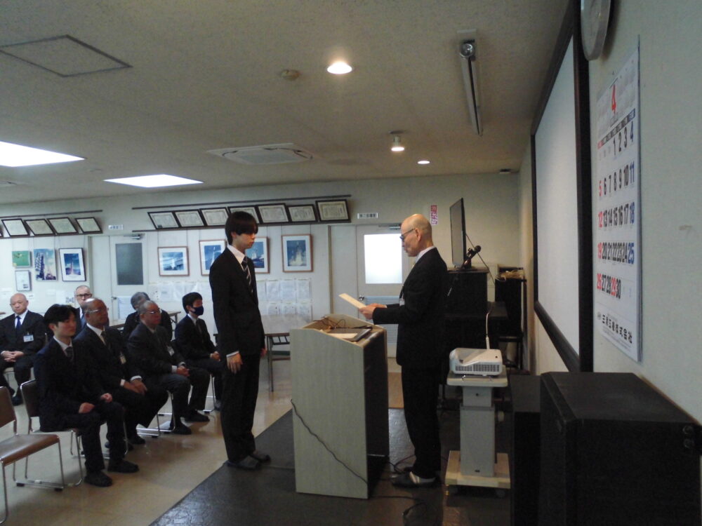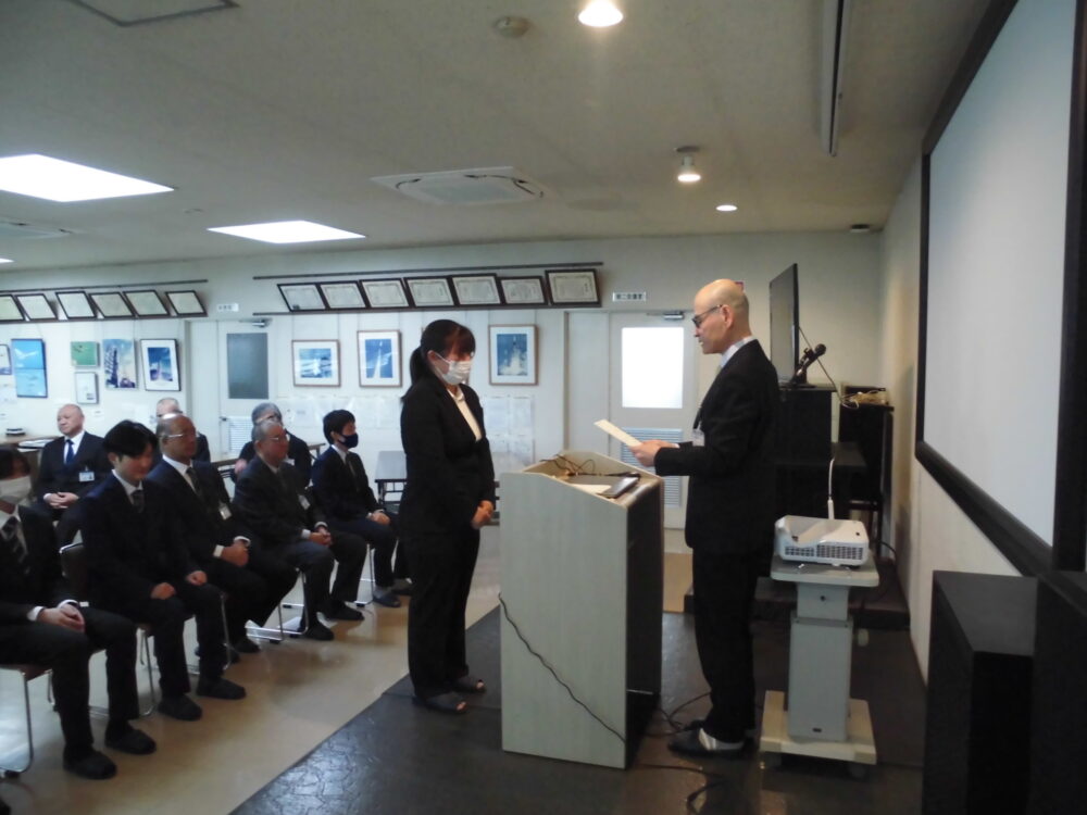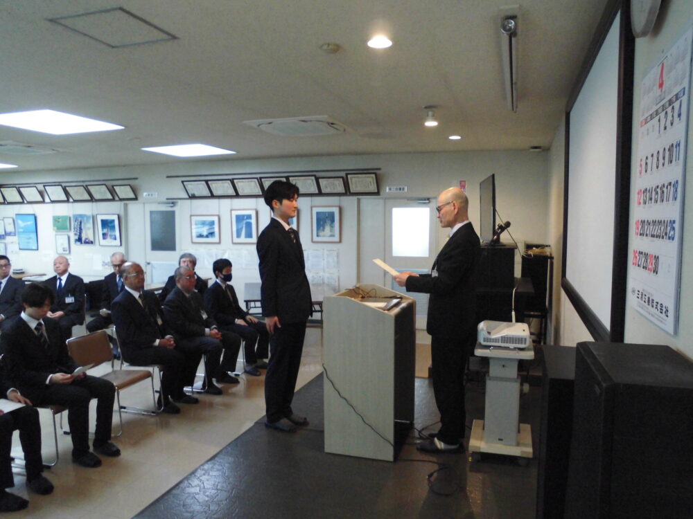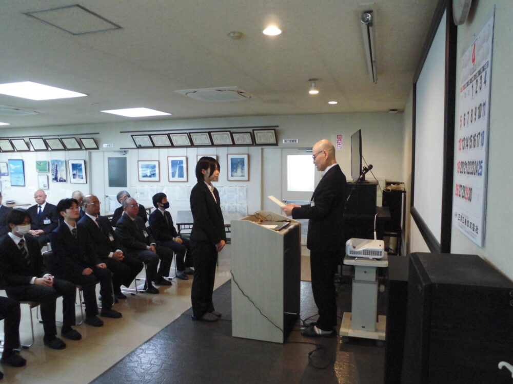 式では社長から辞令の交付や、役員や部門長からの挨拶、新入社員からの一言をいただきました。